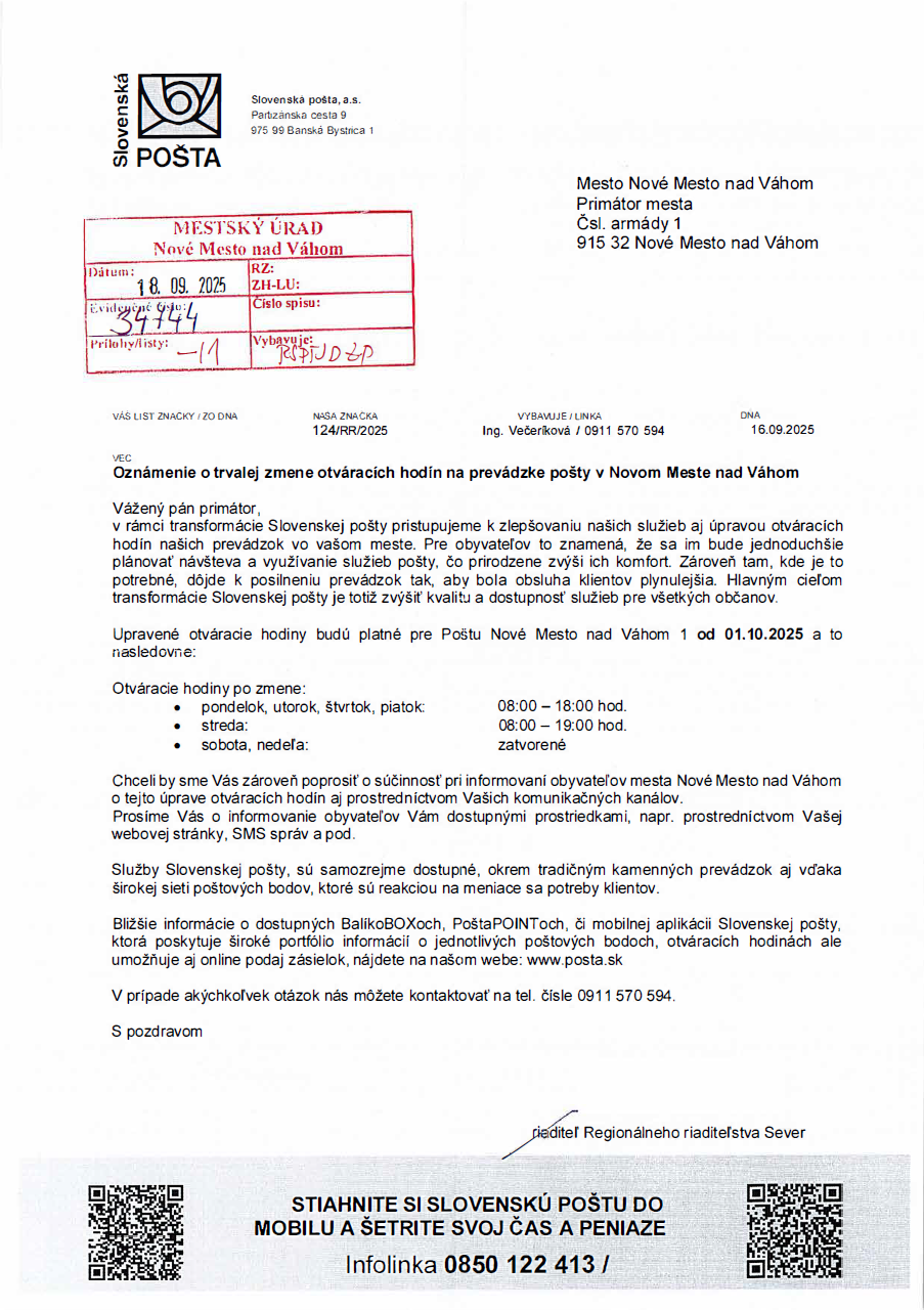 Slovenská pošta oznamuje zmenu otváracích hodín od 1. októbra 2025.